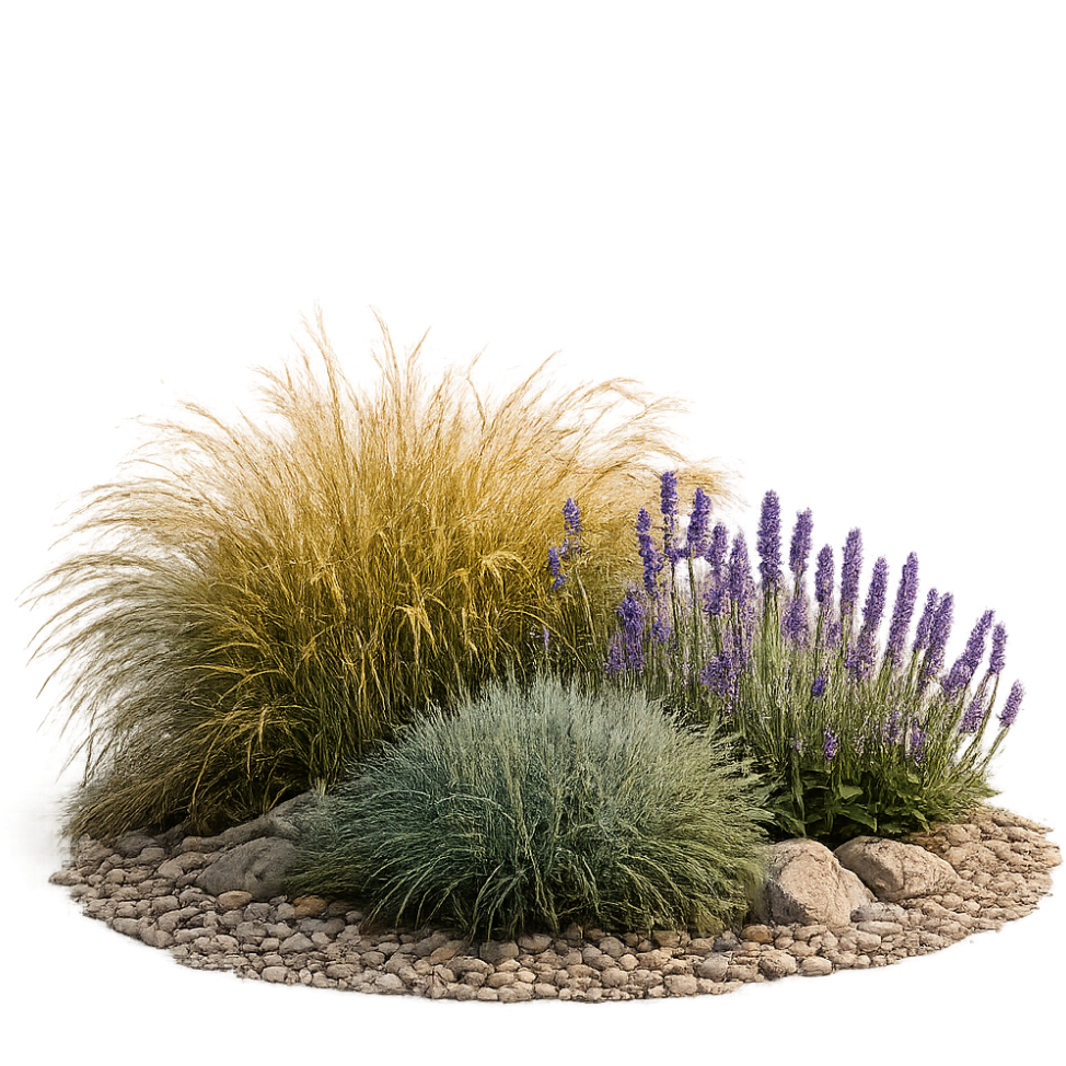 - Paisajismo ornamental contemporáneo, con gramíneas como festucas y stipas que aportan textura, movimiento y modernidad.