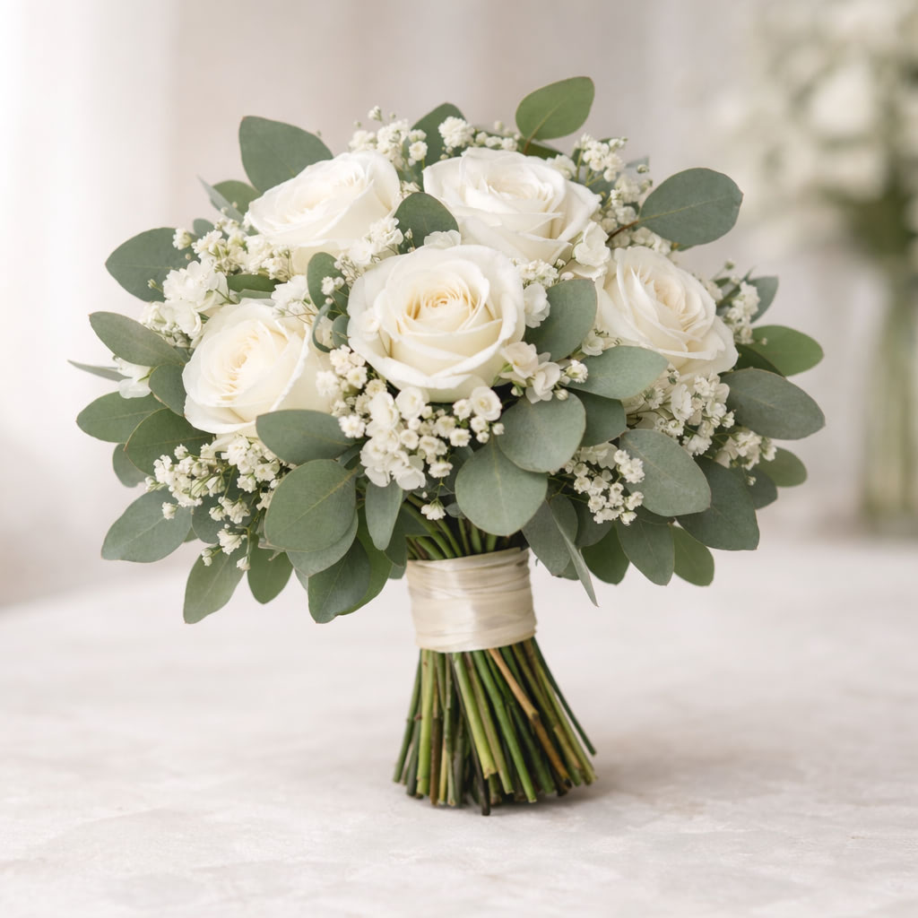 Elegante combinación de rosas blancas y eucalipto, pensado para conservarse intacto durante años.